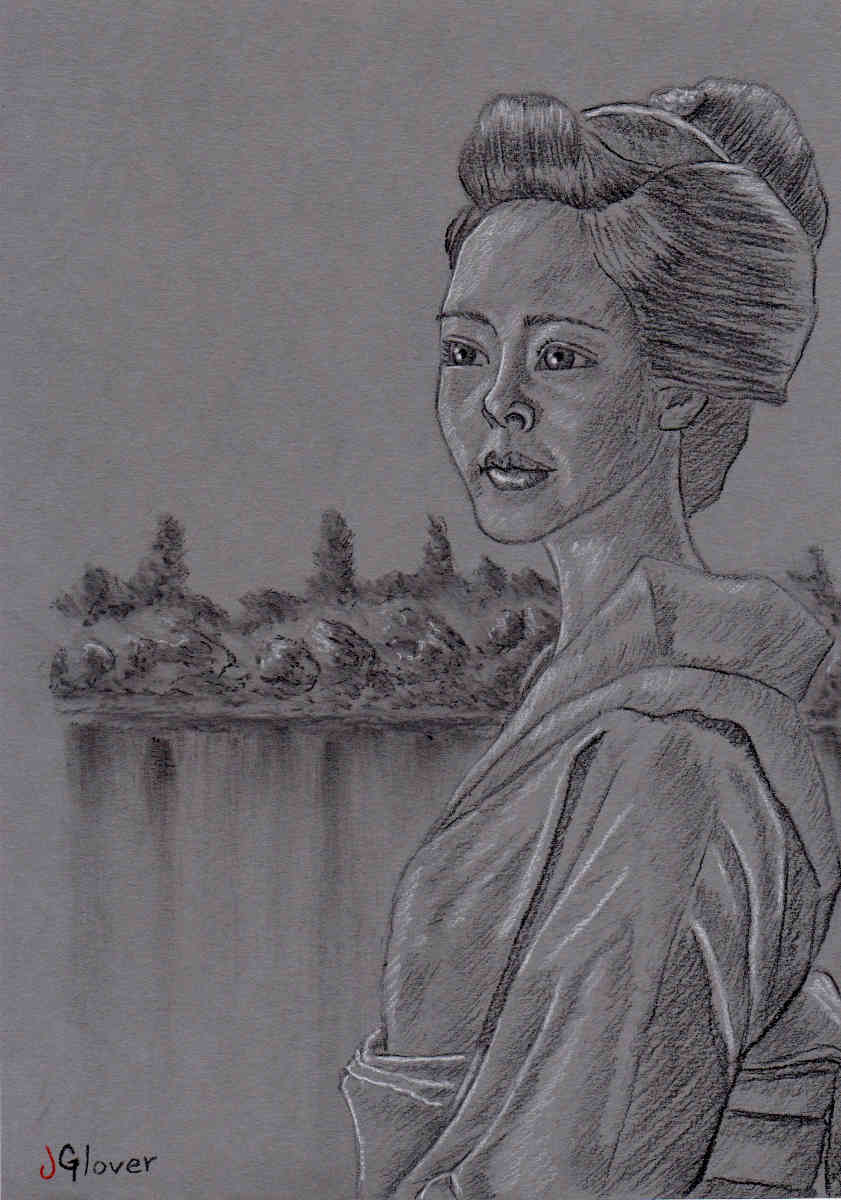This post showcases JGlover’s original charcoal drawing of a kneeling Geisha from Kyoto, Japan.